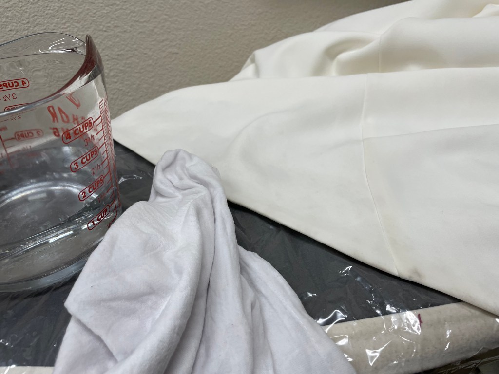 Not to worry, we spot-clean, too! Under strong lights, I assessed the gown. Maybe fifteen yards of unadorned satin was spotted from bodice to hem, cathedral train included. I safety-pinned each and every smudge I could find, careful not to mar the delicate fabric. 25 pins in, I heaved the dress to the hanging chain and ironing board; where I proceeded to hand treat each and every blemish held fast with a pin. Some of them I addressed twice for good measure. When I was through, I left the gown hanging to dry, committing to come back in a bit for another inspection.