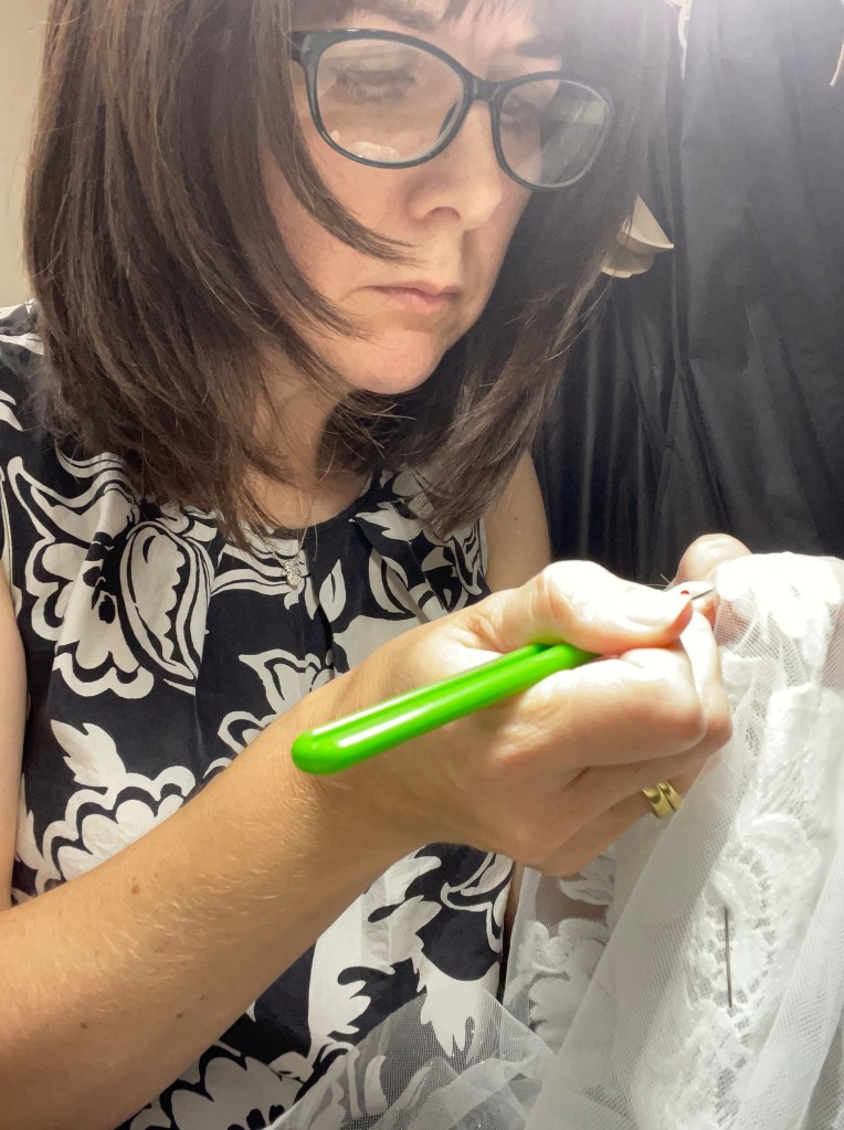 I do not rip stitches unsupervised. There is always a master seamstress within reach. It’s better to ask a question before the whole gown comes apart. We only rip seams with the end goal in mind.